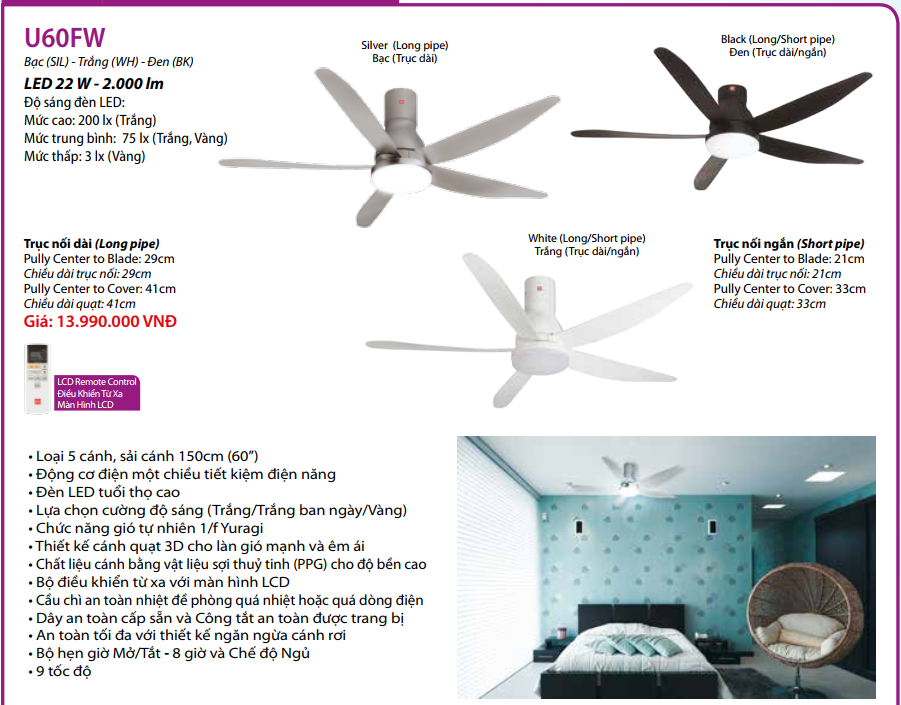 Quạt trần KDK U60FW là một loại quạt trần được sản xuất bởi công ty KDK – một thương hiệu nổi tiếng của Nhật Bản trong lĩnh vực sản xuất các thiết bị điện gia dụng. Được thiết kế với kiểu dáng hiện đại, mẫu mã đẹp, độ bền cao và tính năng hoạt động ổn định, Quạt trần KDK U60FW đã được sử dụng rộng rãi trong các công trình xây dựng và các gia đình trên thế giới hiện nay